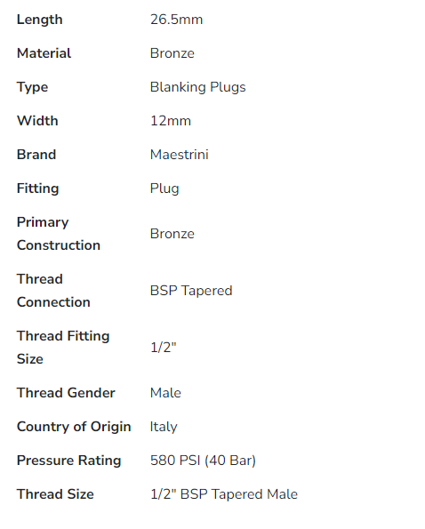 The Maestrini tapered pipe plug is made from bronze and has a 1/2" BSP tapered male thread. This material is tough and corrosion resistant making it suitable for exposure to sea water. This plug acts as a blanking cap for female threaded pipes.