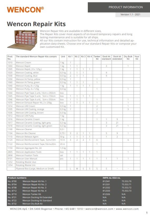 Wencon® Repair Kit 4 (without application tools) Available in various sizes, the Repair Kits offer products for the most common temporary and permanent repairs on board. Read more