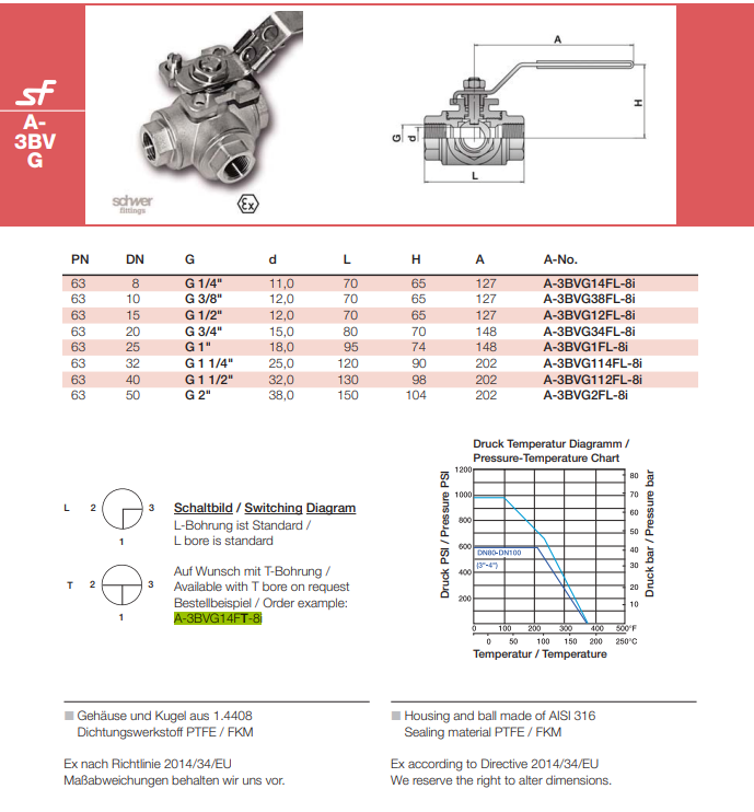 Huis en kogel uit 1.4408, afdichting PTFE/FKM. Alle producten worden ontwikkeld en geproduceerd in overeenstemming met artikel 4.3 van de Europese richtlijn drukapparatuur PED 2014/68/EU. Producten met een nominale diameter van meer dan 25 mm tot en met 32 mm mogen niet worden gebruikt voor het verpompen van vloeistof of gasvormige vloeistoffen van groep 1 (gevaarlijk) overeenkomstig de richtlijn drukapparatuur PED 2014/68/EU. Producten met een nominale diameter van meer dan 32 mm mogen alleen worden gebruikt voor het verpompen van vloeibare vloeistoffen van groep 2 (ongevaarlijke) volgens de richtlijn drukapparatuur PED 2014/68/EU. Bij gebruik met andere media moet een beoordeling door Schwer Fittings worden aangevraagd.