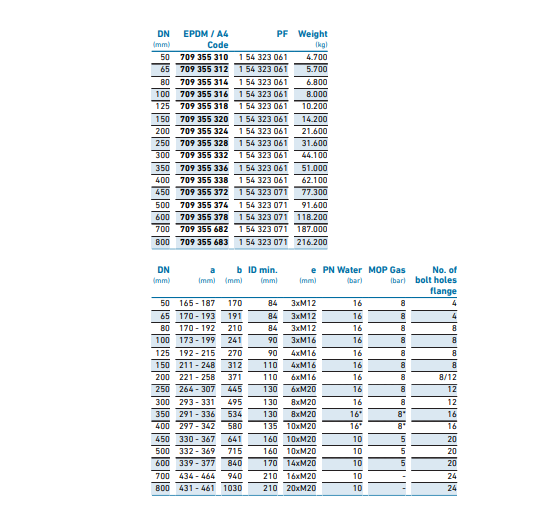 • * DN350 & DN400 voor kunststof buismaterialen = PN 10 bar water / MOP 5 bar gas