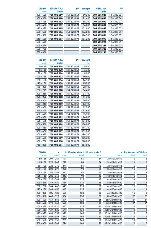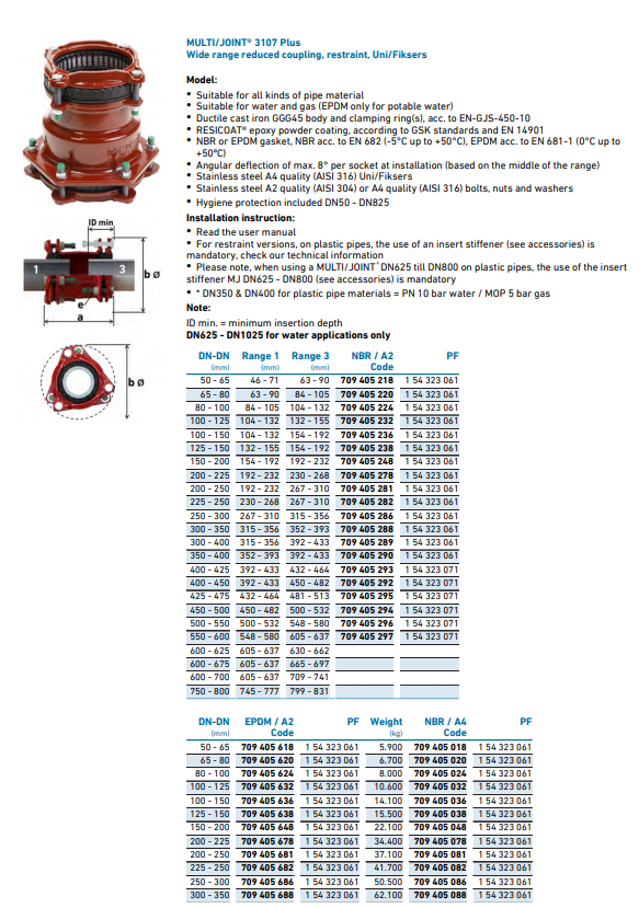 • Let op, bij gebruik van een MULTI/JOINT® DN625 t/m DN800 op kunststof buizen, het gebruik van het inzetstuk verstijving MJ DN625 - DN800 (zie accessoires) is verplicht