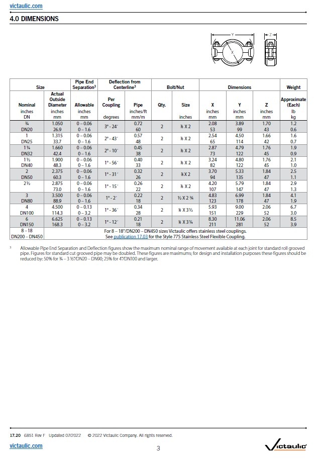 • Voor de maten 8 – 18"/DN200 – DN450 biedt Victaulic roestvrijstalen koppelingen aan. Zie publicatie 17.03 voor de flexibele roestvrijstalen koppeling Style 77S.