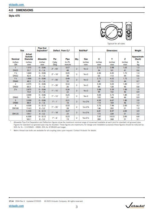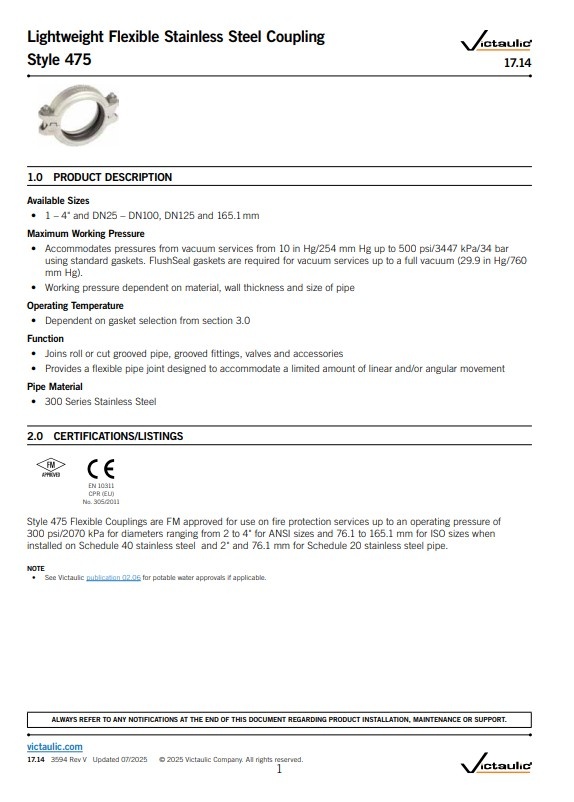 Victaulic Flex Style 475 RVS316 Maten van 1 – 4″ | DN25 – DN125 en 165,1 mm Drukken tot 500 psi | 3447 kPa | 34 bar Lees meer