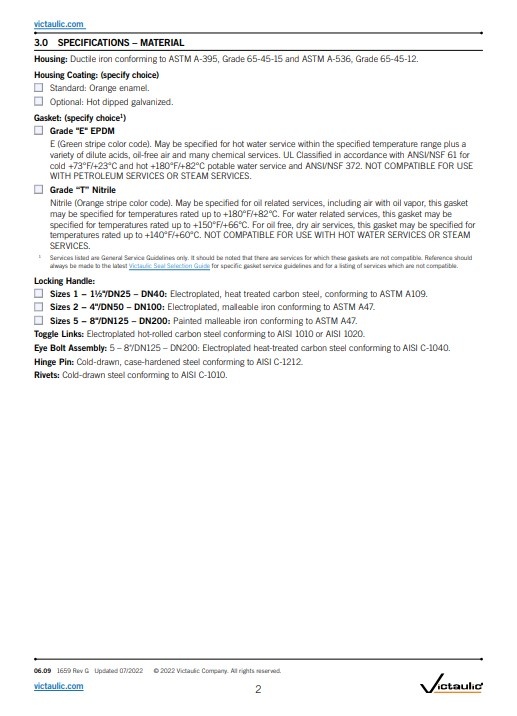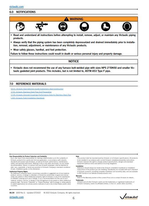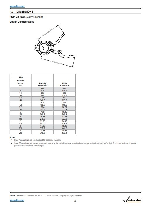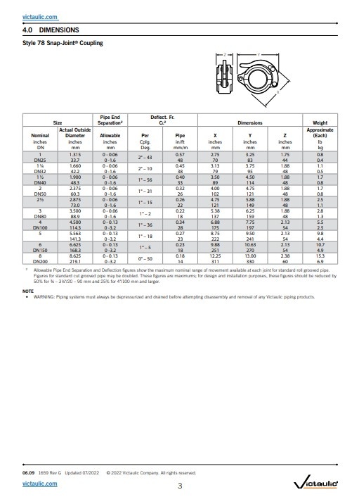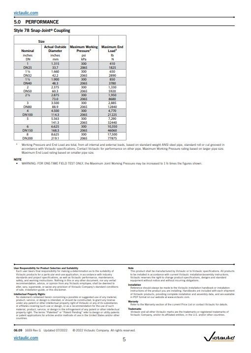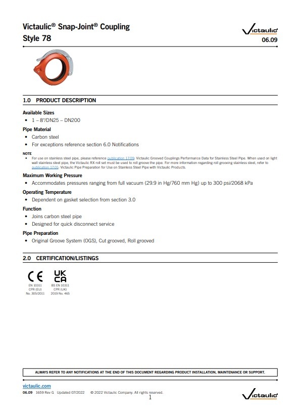 Victaulic® Snap-Joint® koppeling type 78 Geschikt voor drukwaarden variërend van volledig vacuüm (29,9 in Hg/760 mm Hg) tot 300 psi/2068 kPa 21 bar.