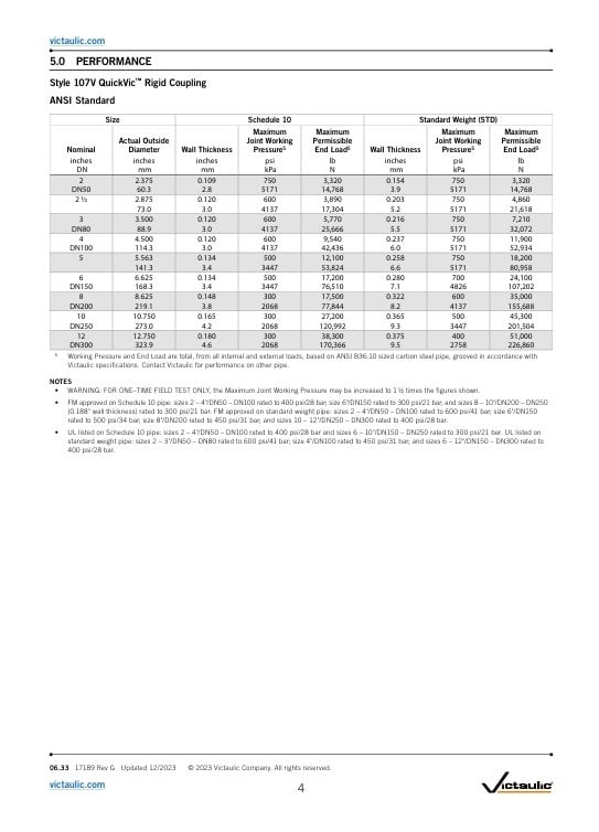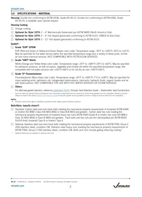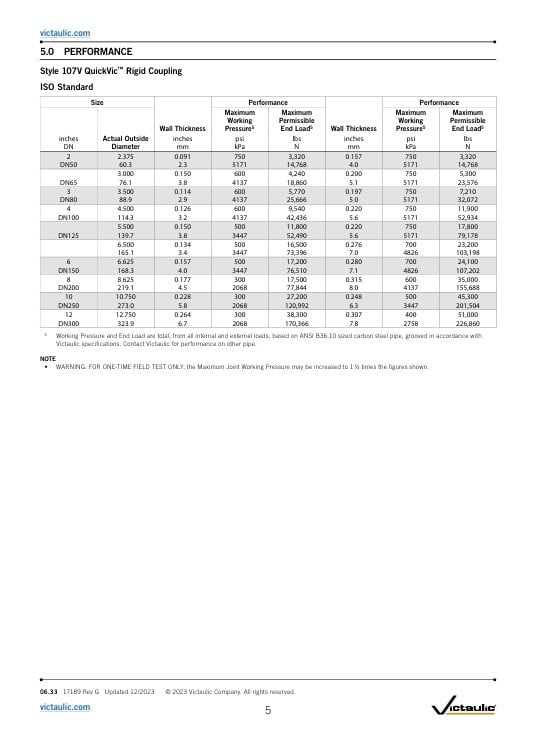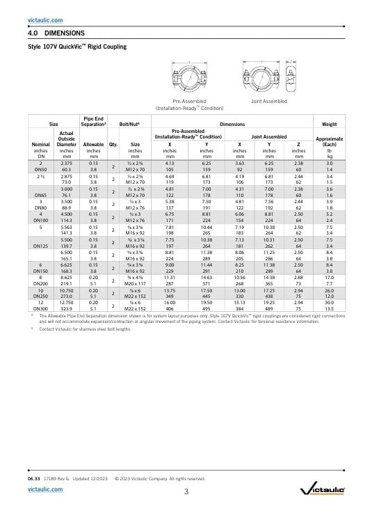 Victaulic QuickVic starre koppeling stijl 107N / EPDM GALVA Beschikbare afmeting 2 – 12"/DN50 – DN300 Buismateriaal Koolstofstaal; roestvast staal Voor uitzonderingen, raadpleeg Hoofdstuk 6.0 Opmerkingen. Lees meer