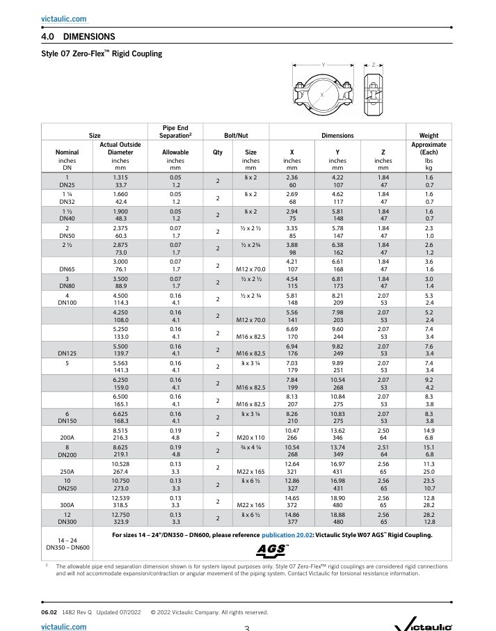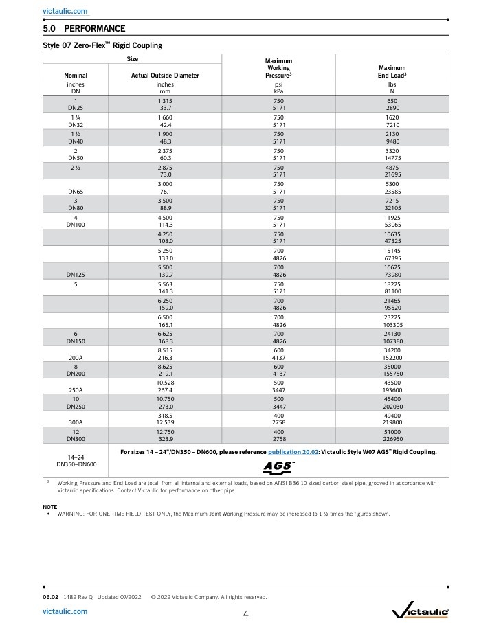 Victaulic starre koppeling type 07 verzinkt EPDM Beschikbare afmetingen: 1 – 12"/DN25 – DN300 Voor maten 14 – 24"/DN350 –DN600, raadpleeg publicatie 20.02: Victaulic Model W07 AGS™ Starre koppeling Lees meer
