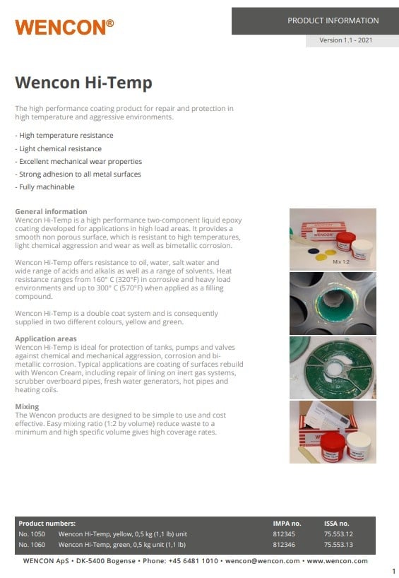 Wencon Hi-Temp is ideaal voor bescherming van tanks, pompen en afsluiters tegen chemische- en mechanische agressie, corrosie en galvanische corrosie. Typische toepassingen zijn het coaten van oppervlakken opnieuw opgebouwd met Wencon Cream, inclusief reparatie van bekleding van inertgassystemen, scrubber overboord buizen, zoetwater generators, warme leidingen zoals stoomleidingen, warmwaterleidingen en verwarmingsspiralen in tanks.