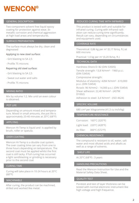 Wencon Hi-Temp is een hoogwaardige twee-componenten vloeibare epoxy coating ontwikkeld voor toepassingen in zware omstandigheden. Het biedt een glad niet poreus oppervlak, welke bestand is tegen hoge temperaturen, licht chemische agressie en